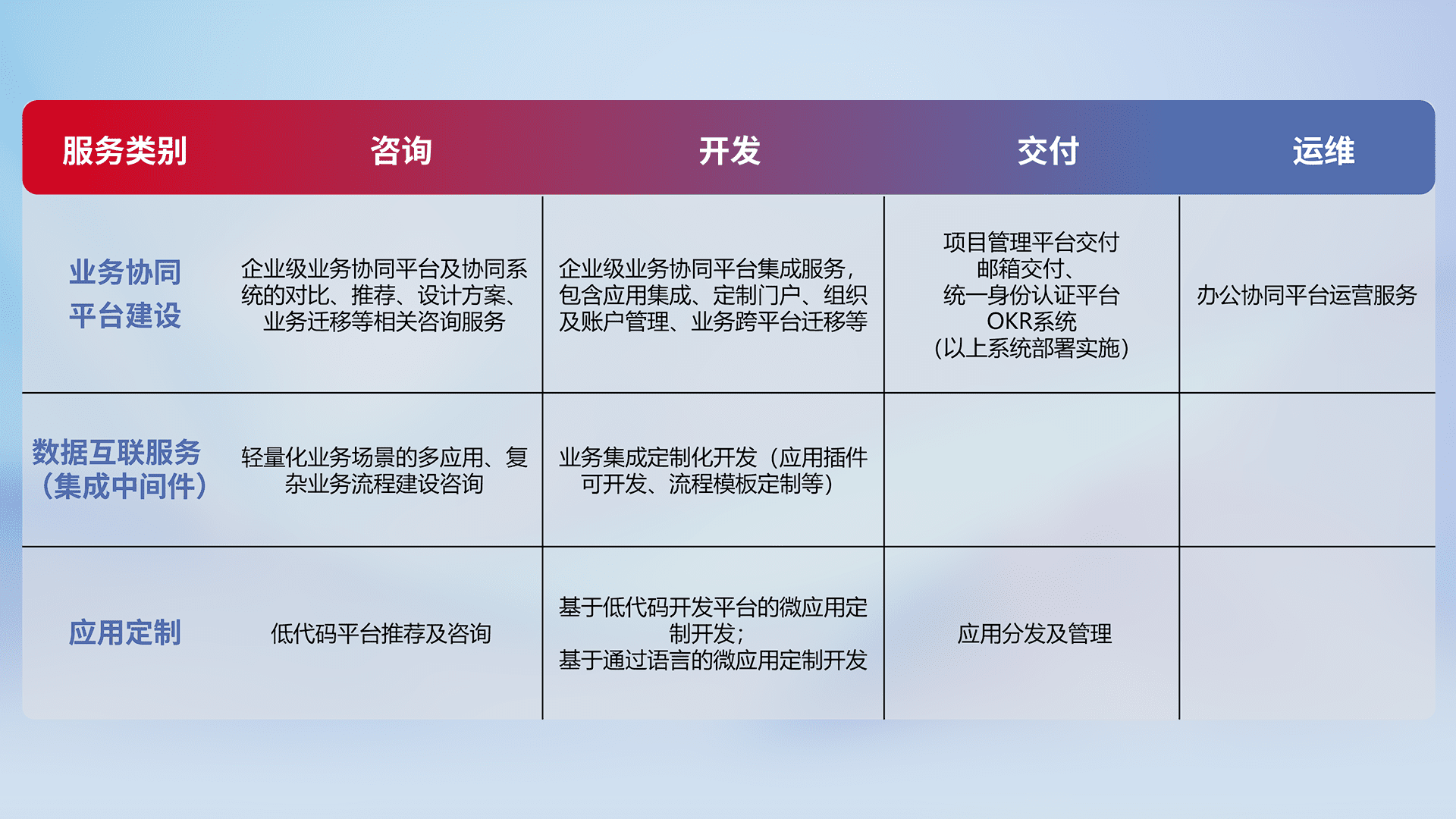 针对钉钉、、、、企微、、、IDaas等平台级产品提供产品的规划、、、、方案、、、、交付、、、定制化开发等服务,,,,实现如统一协同办公、、智能客户服务、、混合会议管理、、、智能数据查询、、、等业务场景,,,,实现数字化转型。。。。
