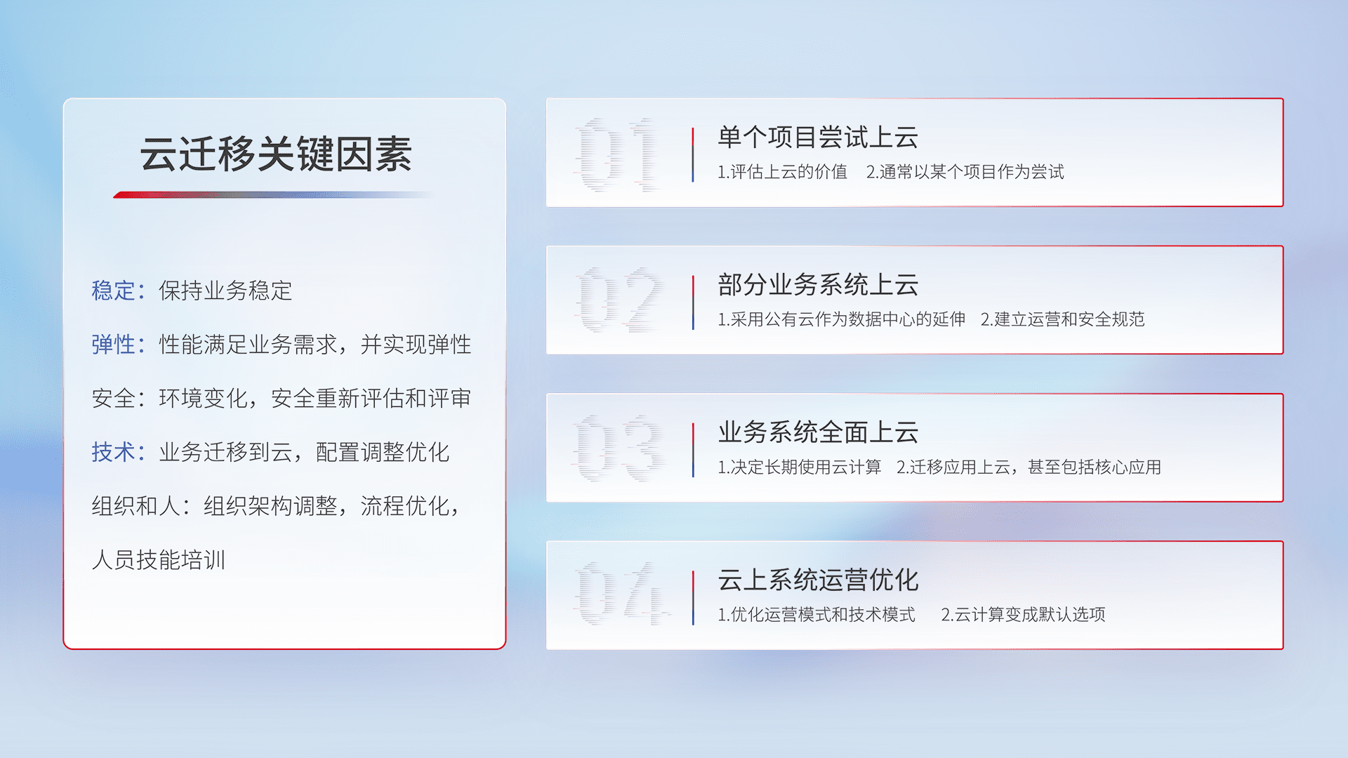 结合实际业务,,,,从规划设计、、、、云平台选型、、云原生改造、、、数据迁移、、集成交付,,,,迁移全过程为客户识别最佳上云路径,,,做好风险识别管理,,,,设计网络架构、、、、身份权限、、、、安全审计合规、、操作审计、、日志审计、、、监控告警策略、、、多站点容灾设计等,,,对云上基础设施进行整体规划,,,提升IT治理水平,,,以满足弹性、、、高可用、、、、高性能的需求。。。