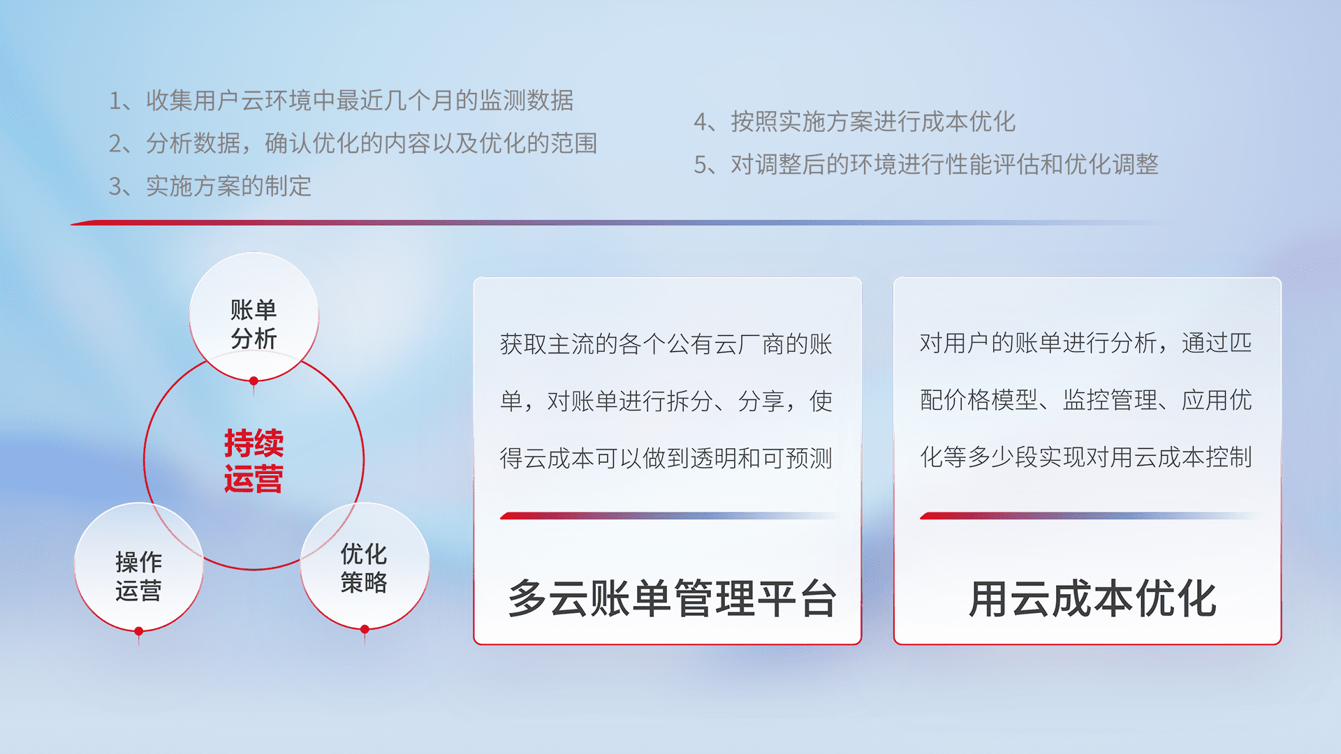 通过多云纳管,,以统一的资源数据模型把客户的云资源进行抽象和封装,,,进而实现对多云资源的统一操作,,,,保障云资源管理的可靠性、、稳定性与可用性。。。。量身定制化运维内容,,,配置、、、、开发运维、、、、补丁管理、、、备份、、、监控、、、、认证和访问管理、、、审计和日常巡检等,,保障在用云过程中的可靠度,,,稳定度以及高可用率。。。